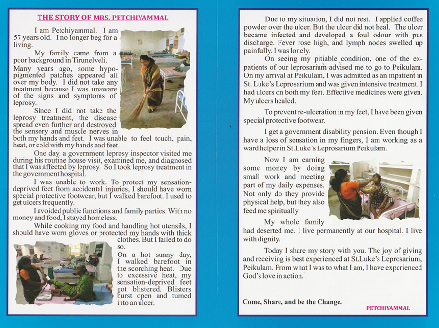 While Eeswari was still in her mother's womb, Eeswari's father deserted her mother. A few years later, she died. When Eeswari was ten years old, some patches appeared on her hands. There was practically no one to care for this motherless child and none to take her to a doctor. After a few years, the leprosy bacilli destroyed the sensory nerves of her hands and feet. One day she accidentally stepped on a sharp stone, which injured her right foot. She did not feel the pain of the injury and continued to walk on the injured foot. After a few days, the injury got infected and turned gangrenous. Septicaemia set in.